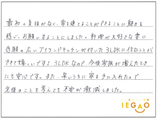 料理が大好きな妻に念願の広いアイランドキッチンが付いた3LDKに住むことができて嬉しいです!3LDKなので今後家族が増えた時にも安心です。また、早いうちに家を手に入れられたので老後のことを考えても不安が激減しました。